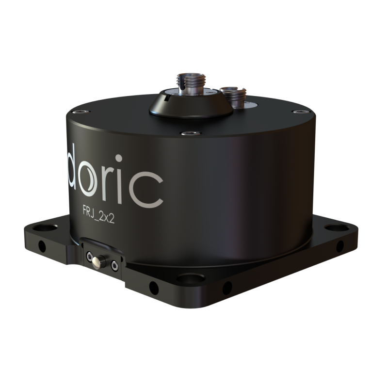 2x2 Fiber-optic Rotary Joint optically connects two optical fibers on its stationary side with their counterparts on the rotating side. Two optical channels follow separate paths and have low loss, small-signal variations during rotation, and no crosstalk. The fixed side has standard FC receptacles, while the rotating side has M3 receptacles.
